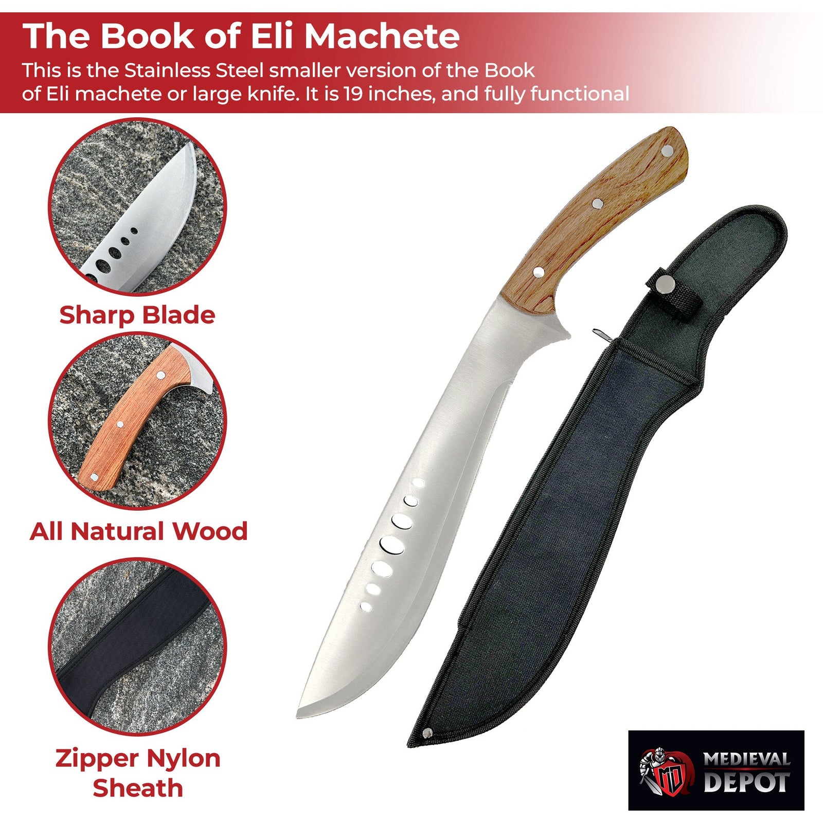 Tackle any challenge with the rugged Book of Eli Movie Machete, built for both survival and style. This compact yet powerful tool features a distinctive kukri-style blade with authentic seven-hole cutouts inspired by the film. Crafted from durable carbon steel with a satin finish, it maintains a sharp edge while resisting corrosion. The natural wood handle, secured with three solid rivets in a full-tang construction, offers a comfortable and secure grip during use. Complete with a heavy-duty nylon sheath featuring a shoulder strap, this machete is ready for wilderness adventures, yard work, or adding post-apocalyptic flair to your collection.