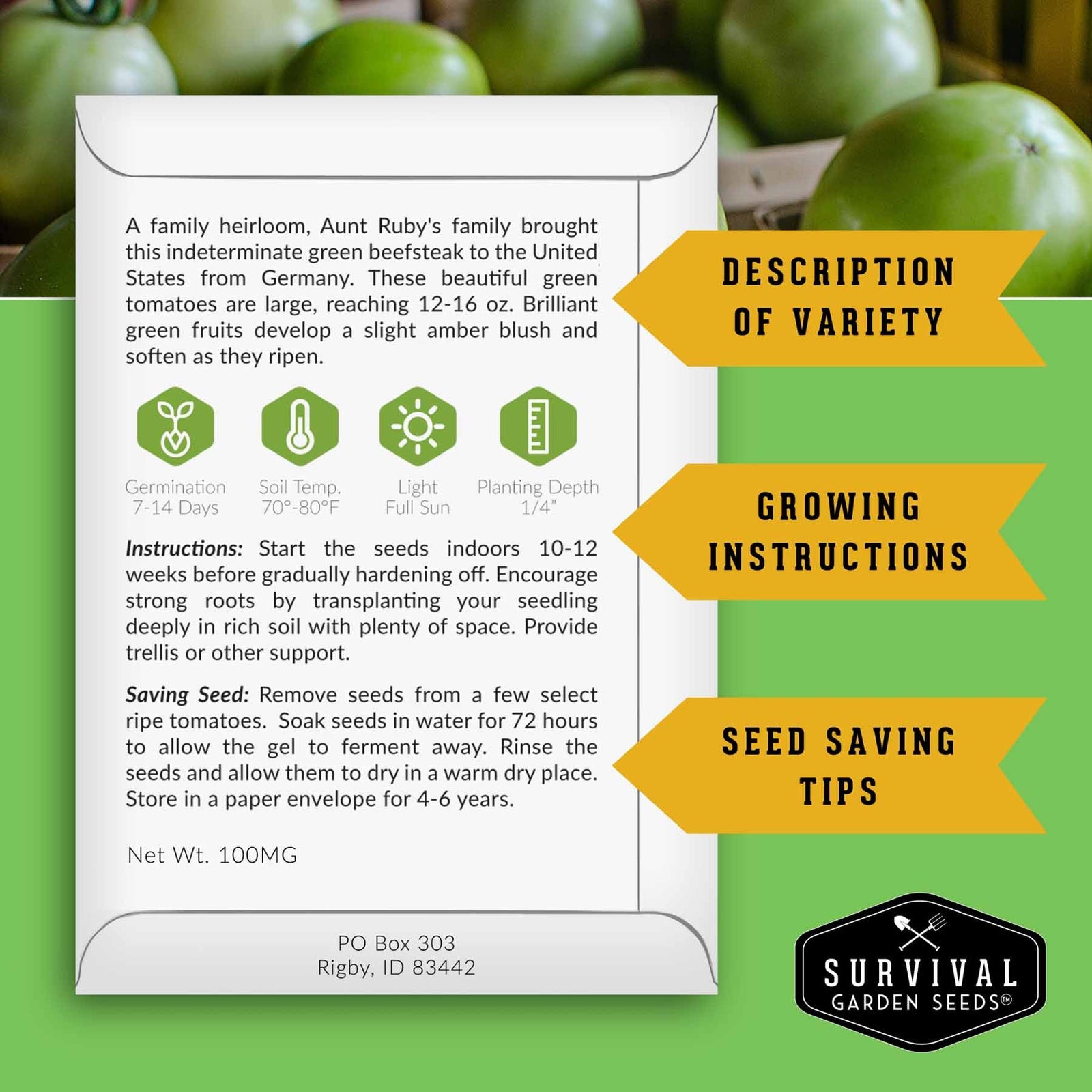Enjoy growing your own colorful and fresh tomatoes in your home vegetable garden with Survival Garden Seeds Colorful Tomato Collection. Black Krim, Great White, Aunt Ruby’s German Green, Hillbilly, & Cherokee Purple tomatoes are tried and true determinate and indeterminate varieties with distinct characteristics and flavor.
