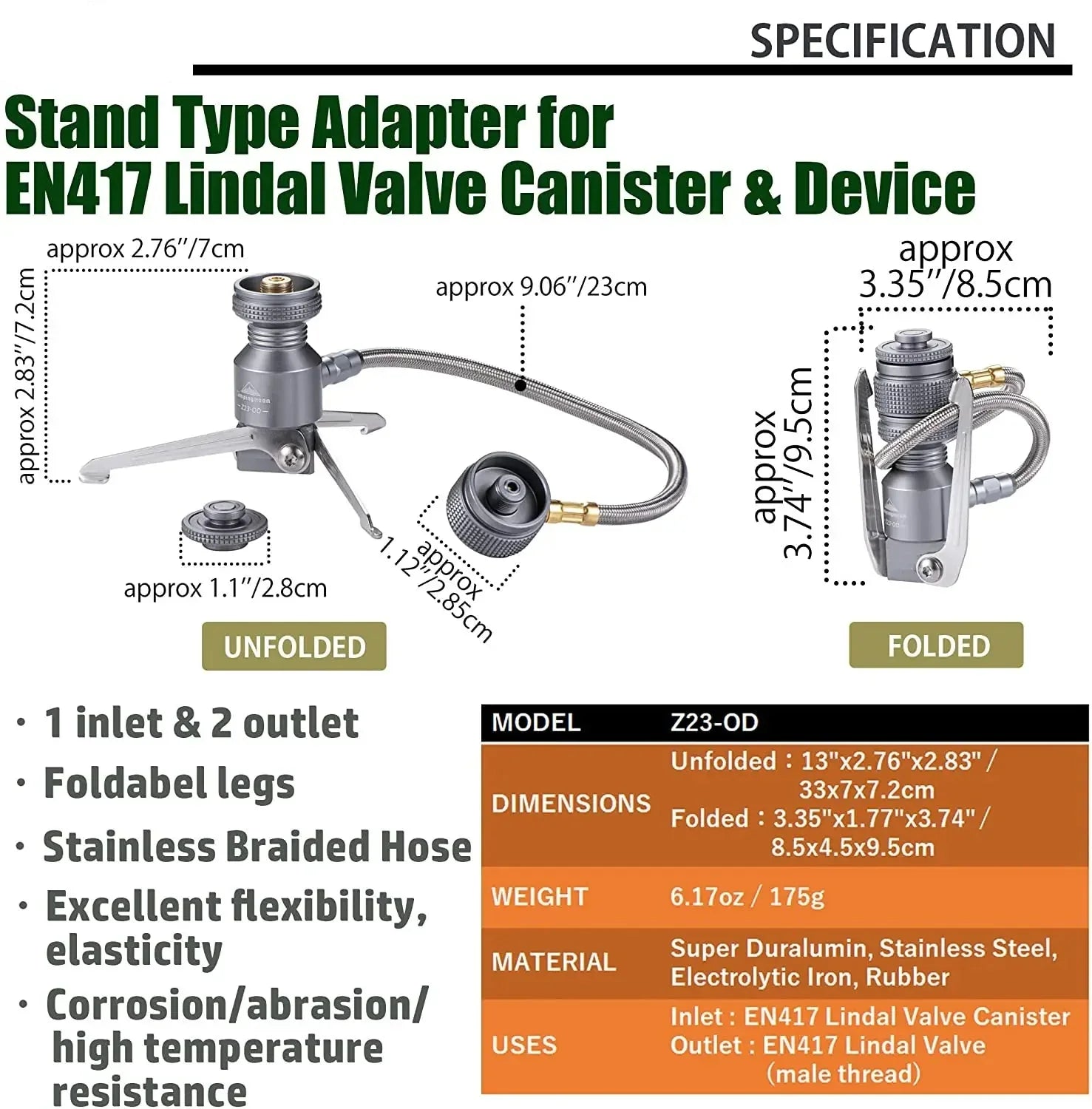 The Camping Outdoor Adventure Rocket Furnace Support with Three-Pin Adapter is designed for outdoor enthusiasts who want stability, versatility, and efficiency in their cooking gear. With its dual stove interface, this adapter allows you to power two stoves from a single gas tank, making it a practical choice for group camping, hiking, or backpacking trips.