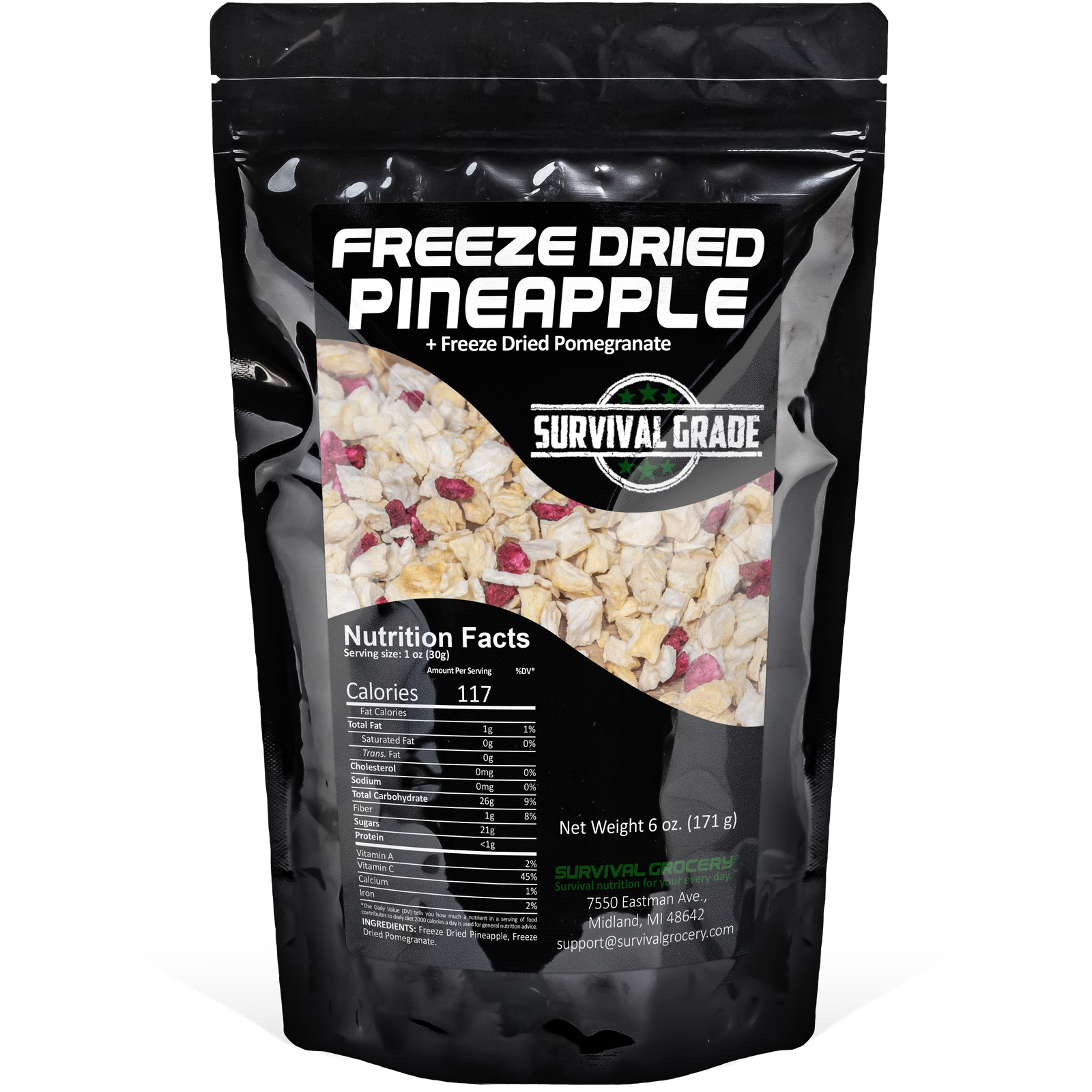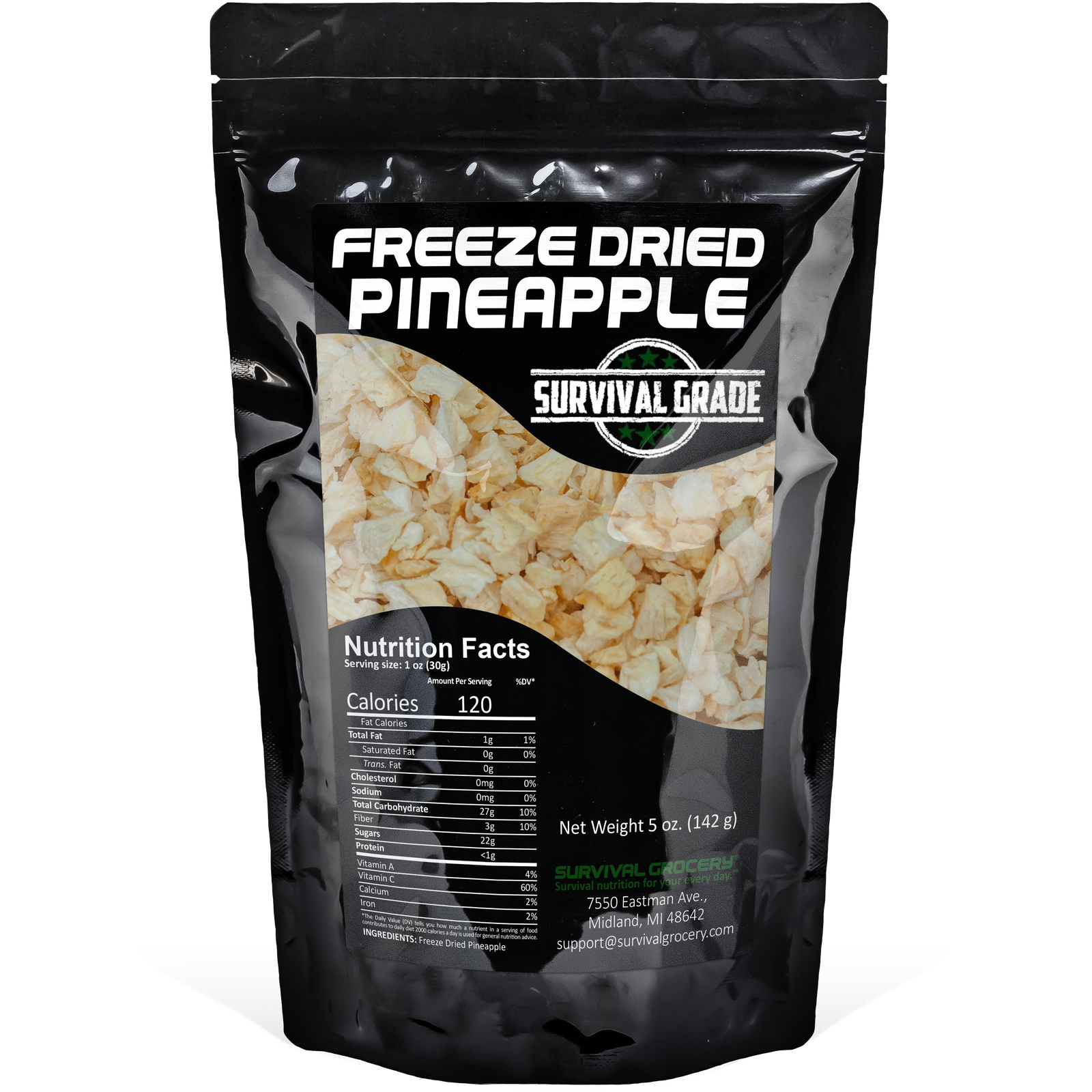 At Survival Grocery we understand that environmental conditions are critical to protecting nutrition. The higher the nutritional value of the food, the more there is to lose. And we only deal with high nutritional value stuff, so... Our Freeze Dried Pineapple is stored in refrigerated conditions in our facility, then packaged in pouches with a strong oxygen & light barrier. (No ineffective breathable or windowed bags here.) Just prior to final package sealing, a desiccant pack and oxygen scavenger pack are added to guard against the vitiating effects of moisture and oxygen. The end result is protected Freeze Dried Pineapple, maximum nutrition intact, arriving to your doorstep.