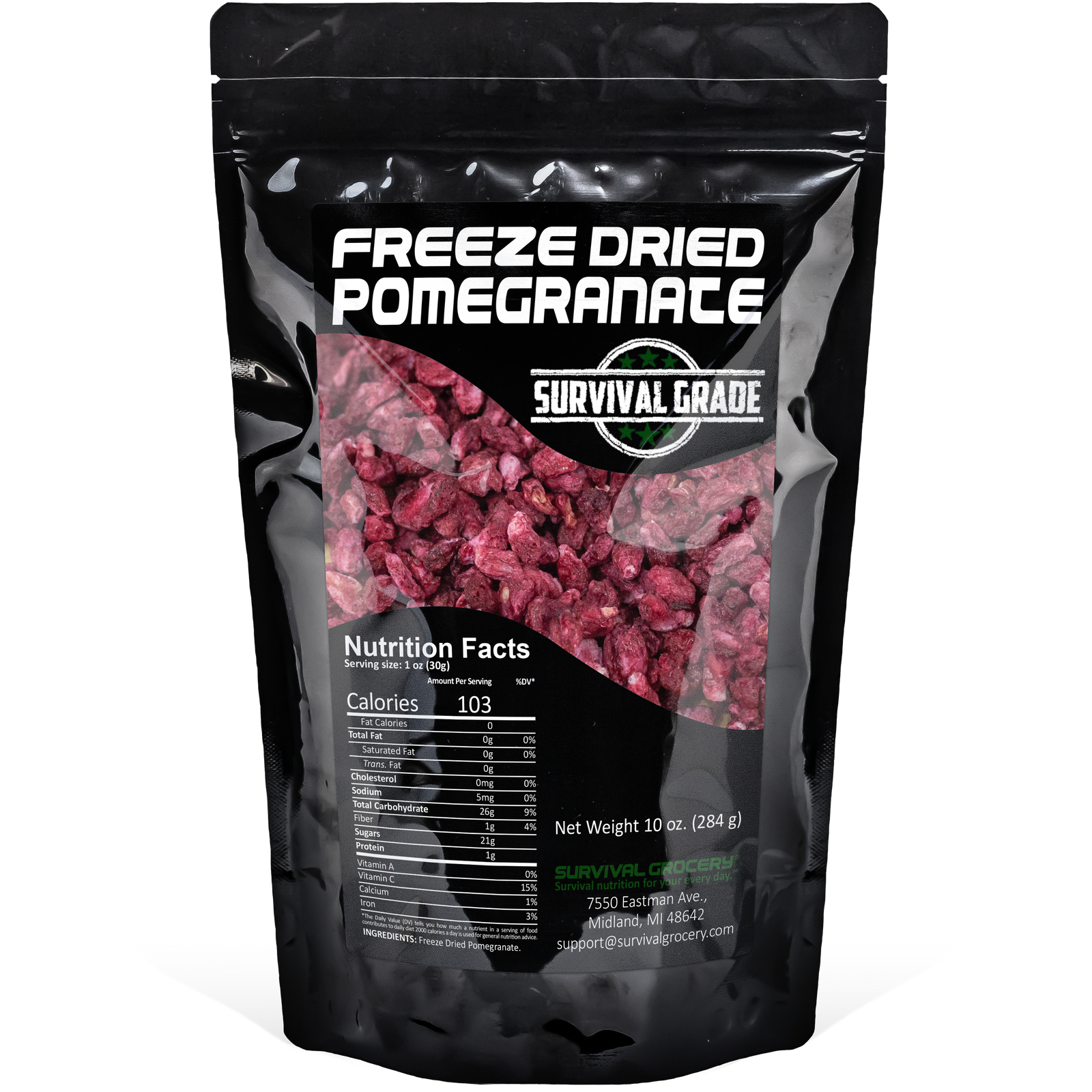 At Survival Grocery we understand that environmental conditions are critical to protecting nutrition. The higher the nutritional value of the food, the more there is to lose. And we only deal with high nutritional value stuff, so... Our Freeze Dried Pomegranate is stored in refrigerated conditions in our facility, then packaged in pouches with a strong oxygen & light barrier. (No ineffective breathable or windowed bags here.) Just prior to final package sealing, a desiccant pack and oxygen scavenger pack are added to guard against the vitiating effects of moisture and oxygen. A desiccant pack is also added to ensure moisture control. The end result is protected Freeze Dried Pomegranate, maximum nutrition intact, arriving to your doorstep.