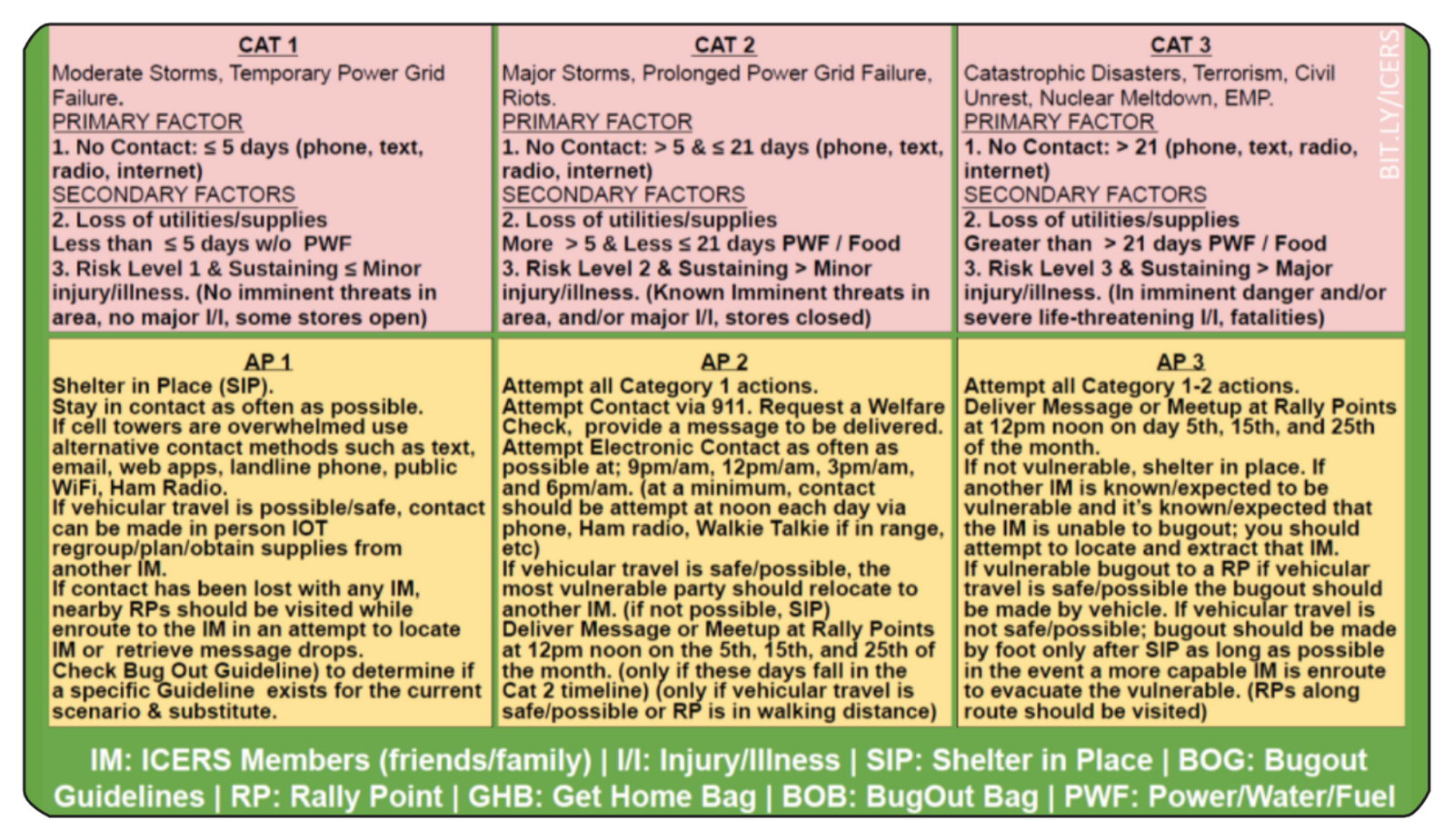 If you already have ICERS, you'll realize that the core usage of the document requires yourself and other ICERS Members (IMs) to self identify what Category (CAT) exists then match it to the corresponding Action Plan (AP). This pair of Decals contain a summary of CATs and APs so they can be accessed in the field or on the go. It also has a quick reference guidline to follow along with a ICE section for writing in your personal emergency contact information.